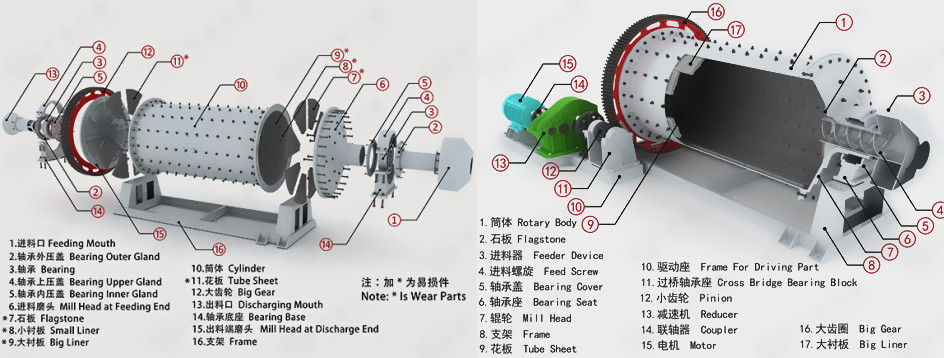 昆重礦機(jī)生產(chǎn)的濕式溢流型球磨機(jī)是由進(jìn)料器、出料器、軸承座、端蓋、法蘭盤、筒體、大齒輪、傳動(dòng)總成(減速機(jī)、小齒輪、聯(lián)軸器、電機(jī))等部件組成。襯板采用13錳鋼耐磨料,具有耐磨及防腐特點(diǎn)。